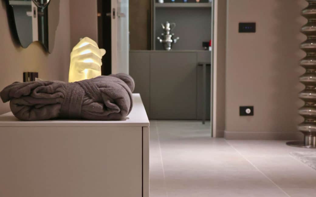 Il bagno è curato in ogni dettaglio, con un design moderno ed essenziale. La doccia doppia è impreziosita da un suggestivo gioco di luci integrate, che crea un'atmosfera intima e rilassante.