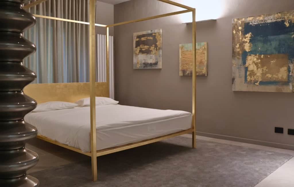 L’ambiente, curato nei dettagli, offre un letto matrimoniale a baldacchino, bagno privato con doccia doppia, TV e arredi di design.